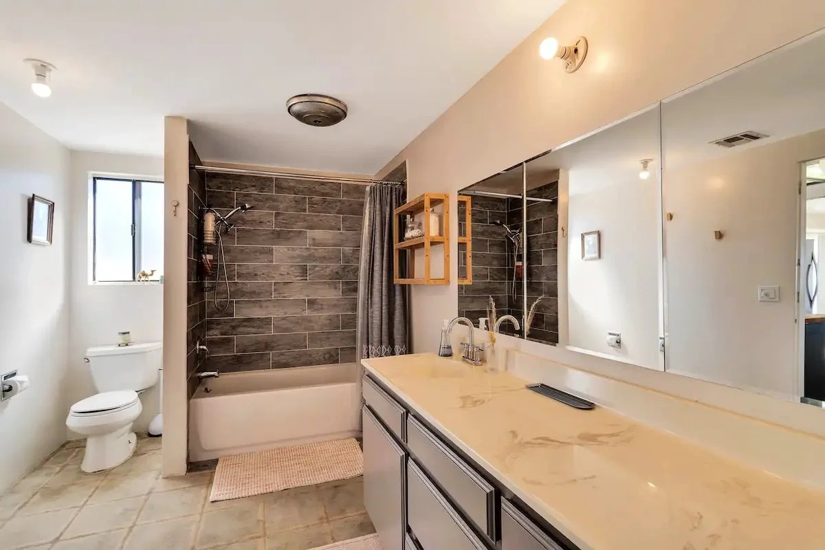 The large bathroom is fully stocked and hosts a tub, toilet, towels, body wash, shampoo and conditioner, and a couple shower heads.
