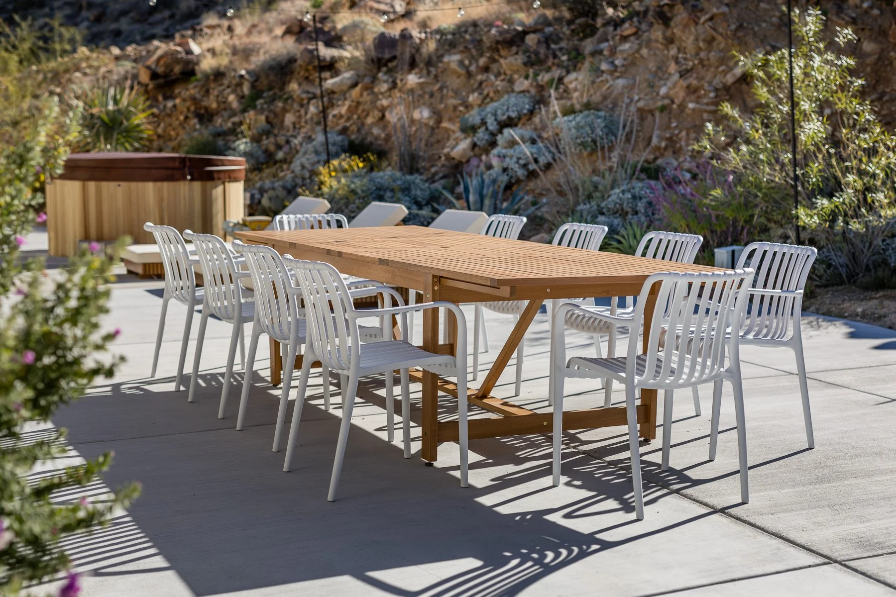 This is a three bed, four bath home up against in the rocks in 29 Palms and a quick drive to 49 Palms Oasis Trail which is part of Joshua Tree National Park. There are two king bedrooms with en suite baths and one double queen bedroom with en suite bath.